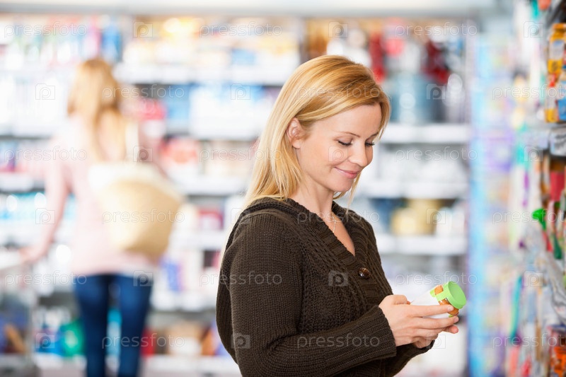 Молодая женщина улыбается, делая покупки