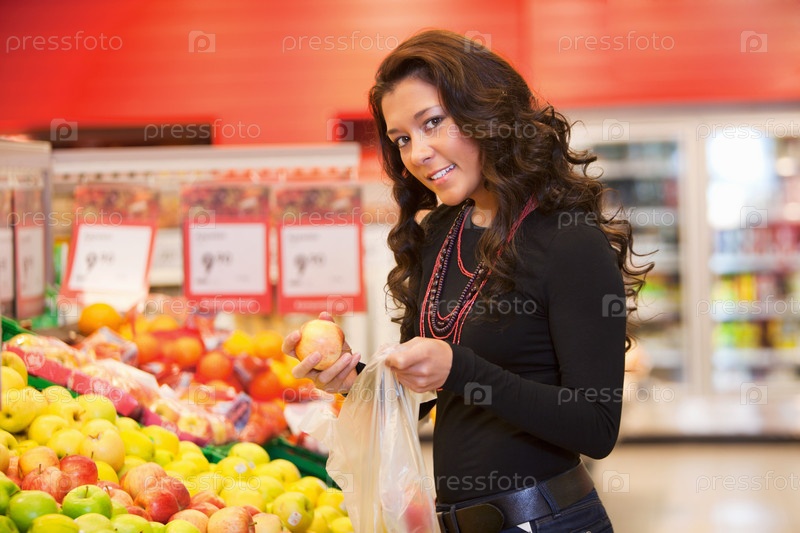 Молодая женщина покупает фрукты