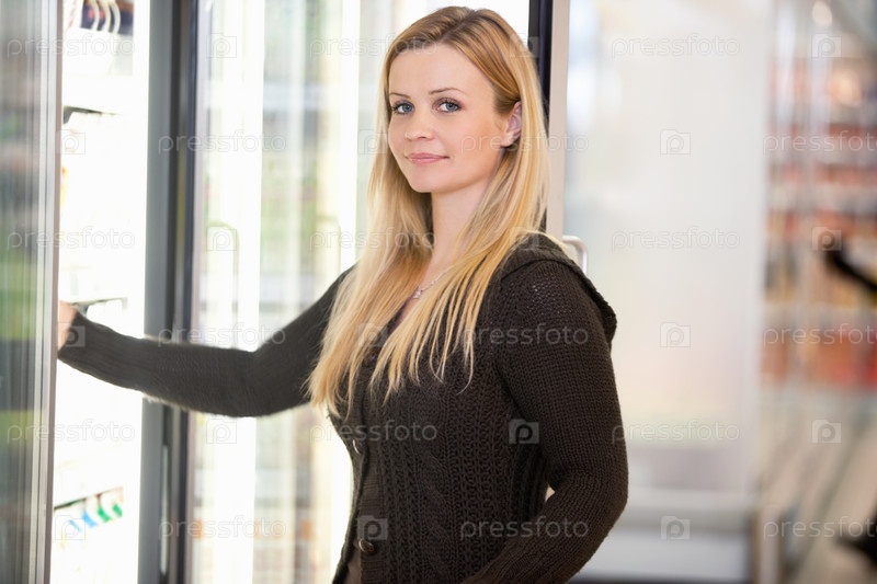 Женщина у холодильника в продуктовом магазине
