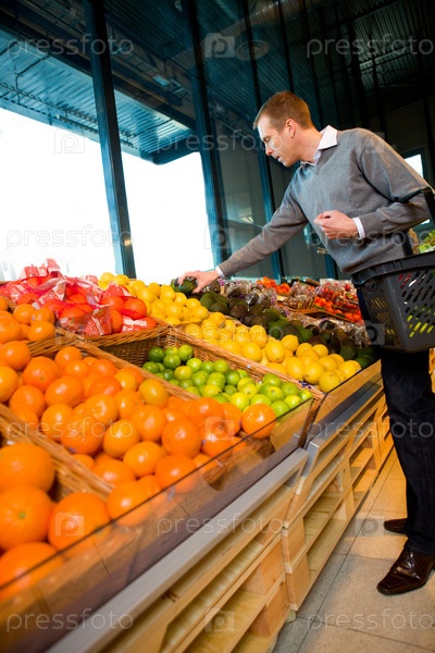 Мужчина выбирает фрукты в супермаркете