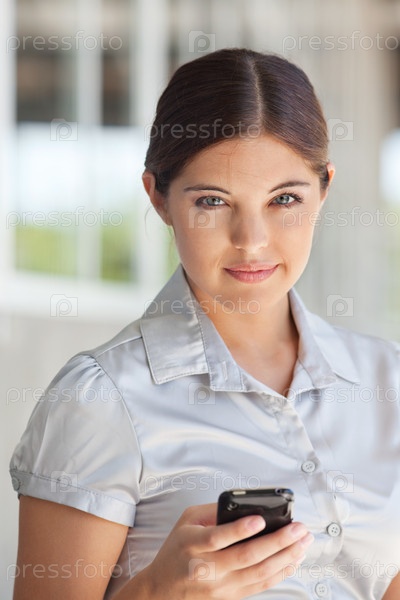 Привлекательная бизнес-леди держит сотовый телефон