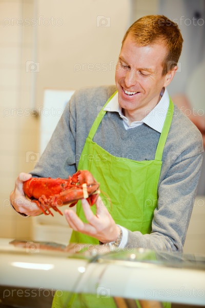 Мужчина держит омара в руках
