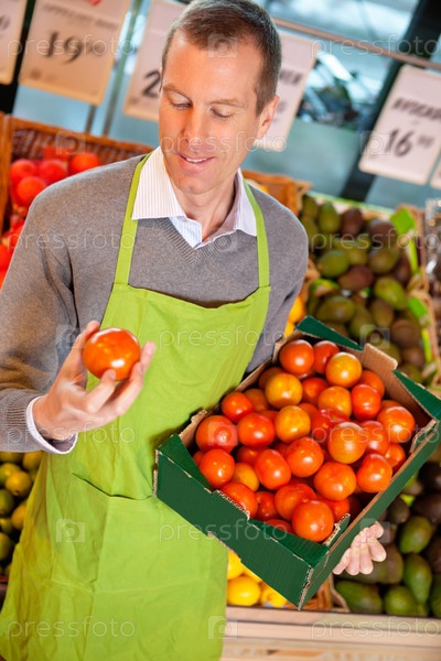 Продавец с помидорами в руках