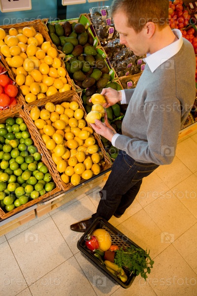 Мужчина покупает лимоны в продуктовом магазине