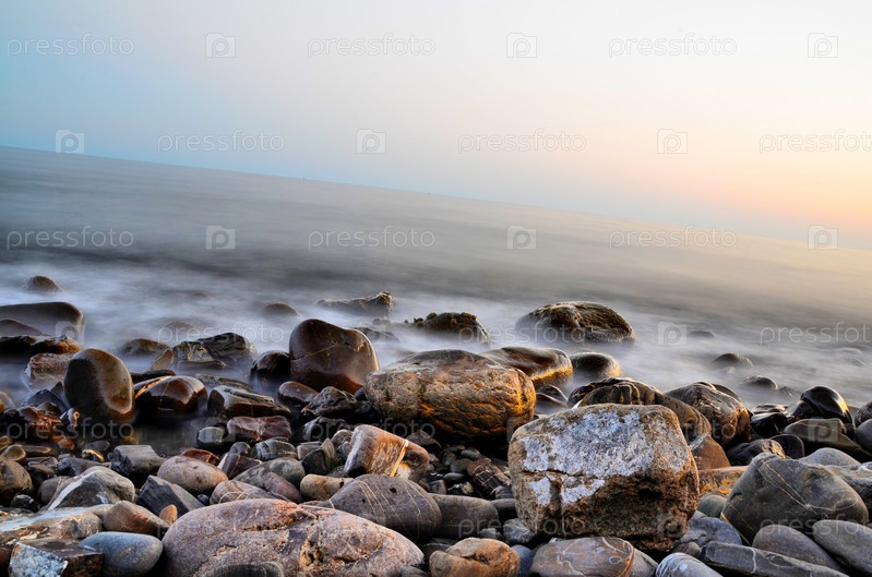 Каменный берег моря в дымке
