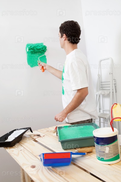 Мужчина красит стену валиком