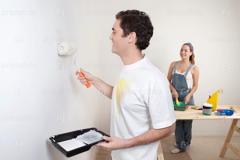 Молодая пара занимается покраской стен в квартире