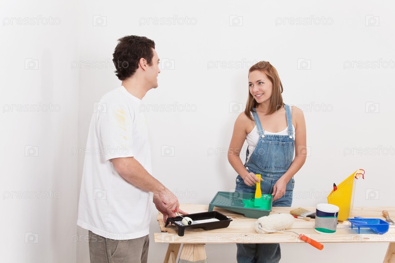 Счастливая пара готовит краску для покраски стен в квартире