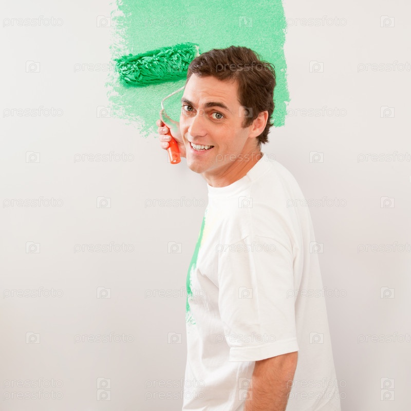 Мужчина красит стену малярным валиком