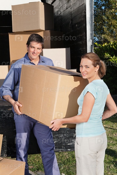 Молодая пара переносит коробку в грузовик