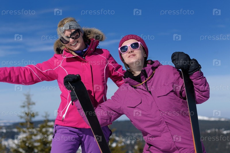Две молодые женщины с лыжами на открытом воздухе