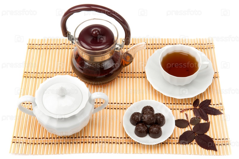 Чашка чая и сладости на блюдце на бамбуковом коврике