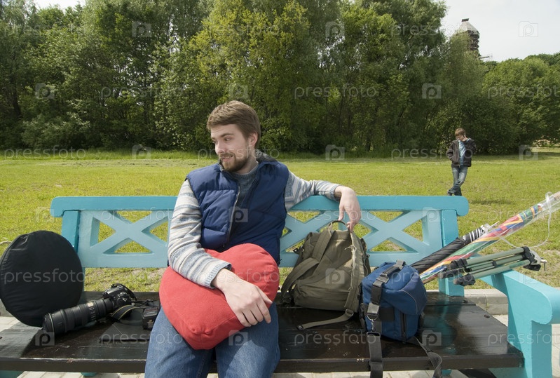 Молодой фотограф после съемки в парке