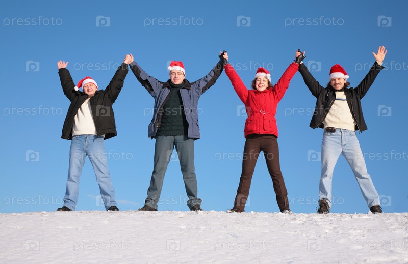 Четверо друзей на вершине холма с поднятыми вверх руками