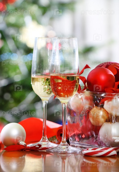 Бокалы шампанского и рождественские украшения