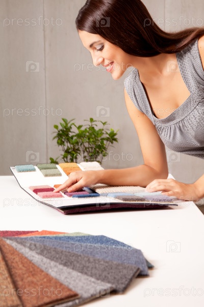 Дизайнер интерьера с образцами коврового покрытия