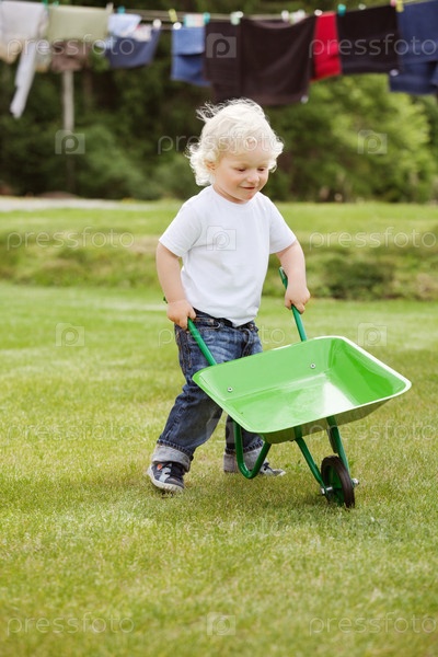 Мальчик толкает тачку