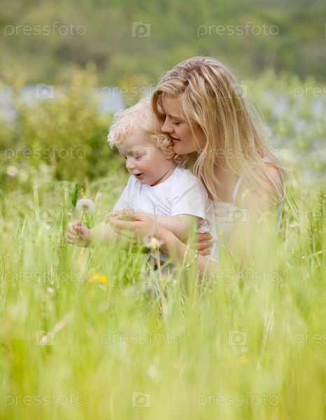 Мать и сын на лугу с одуванчиками