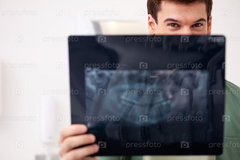 Счастливый улыбающийся стоматолог с рентгеновским снимком