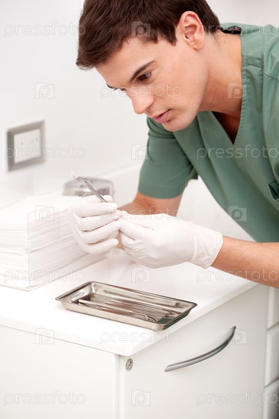 Стоматолог осматривает стерильный инструмент