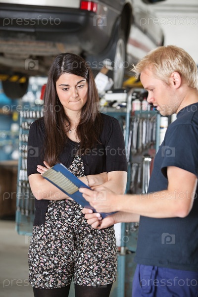 Механик показывает женщине счет