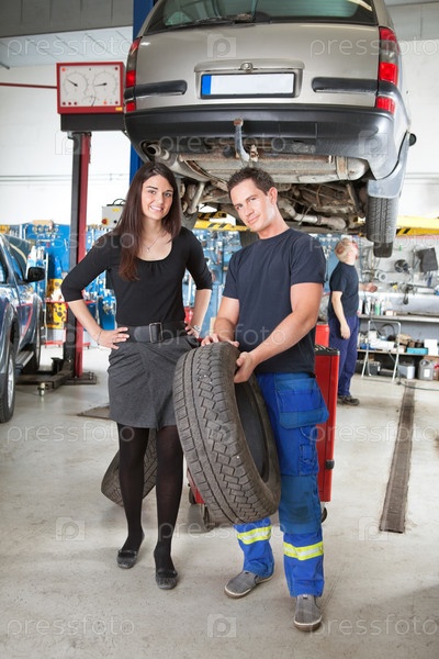 Механик показывает шину клиентке