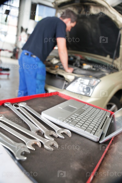 Крупным планом ноутбук и гаечные ключи
