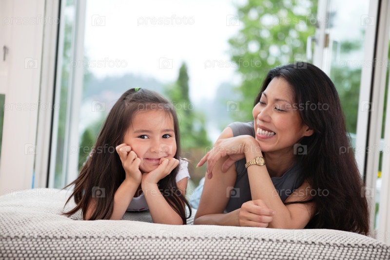 Мать и дочь смеются на диване