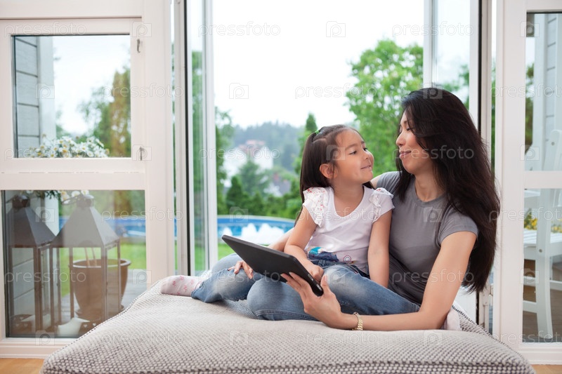 Счастливая мать и дочь с планшетным компьютером