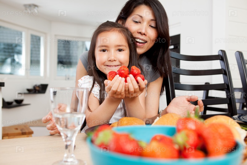 Мать и дочь на кухне с клубникой
