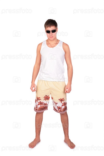 Молодой человек в шортах на белом фоне