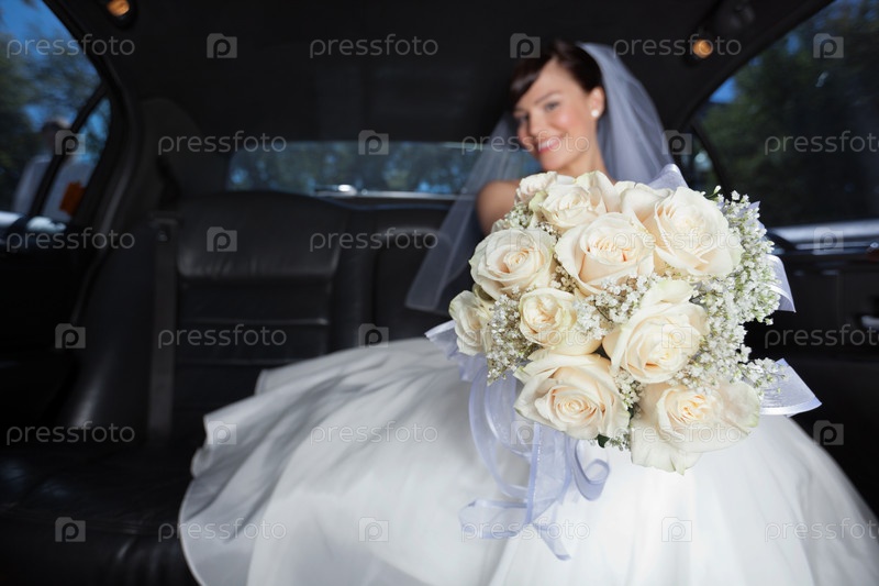 Невеста с букетом в лимузине