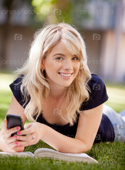 Счастливая молодая студентка с мобильным телефоном