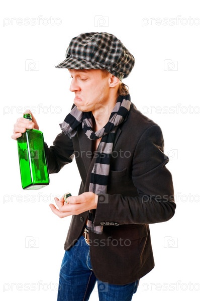 Молодой человек с зеленой бутылкой на белом фоне
