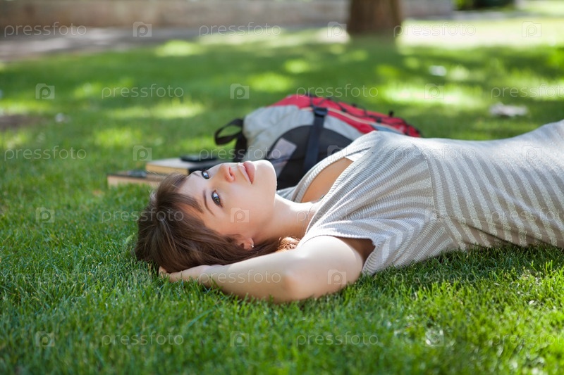 Девушка лежит на газоне на территории кампуса