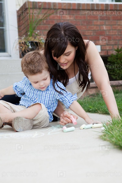 Мать с сыном рисует мелом на тротуаре