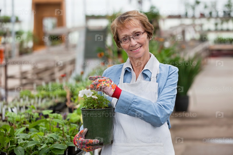 Пожилая женщина, держащая цветочный горшок
