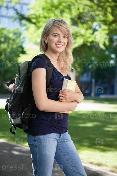 Студентка колледжа с книгой и сумкой