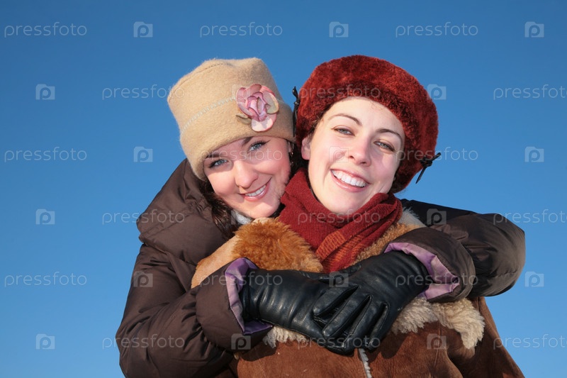 Одна женщина обнимает другую на фоне неба зимой