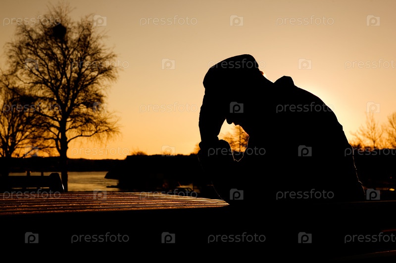 Мужчина в депрессии на закате солнца