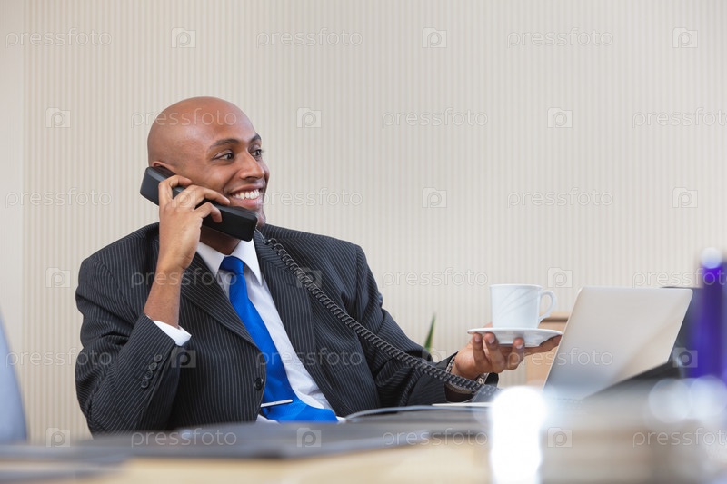 Бизнесмен, разговаривающий по телефону во время перерыва на чай