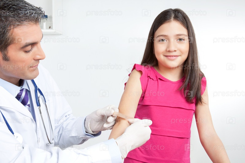 Доктор прилепляет лейкопластырь на руку девочке