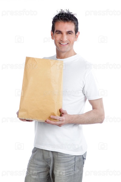 Мужчина держит бумажный мешок