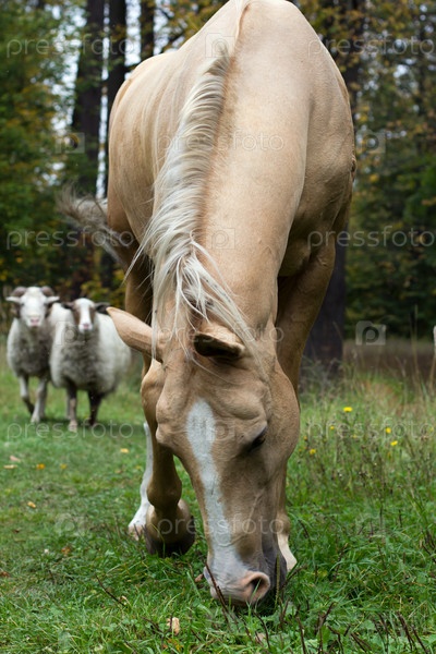 Лошадь щиплет траву