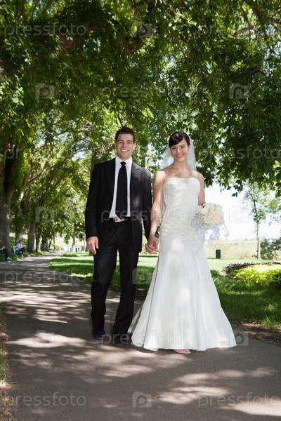 Пара молодоженов, держащаяся за руки