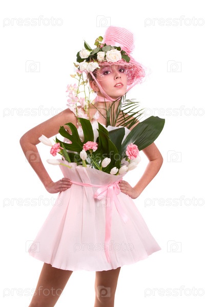 Девушка-букет Элегантная модель с розами в шляпе и тюльпаны, гвоздики, орхидеи в ее платье из упаковки