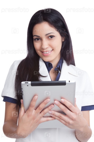 Молодая женщина держит планшетный компьютер