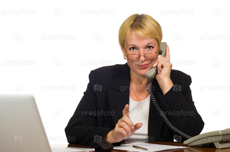 Зрелая деловая женщина звонит по телефону на рабочем месте
