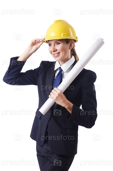 Архитектор с чертежами на белом фоне