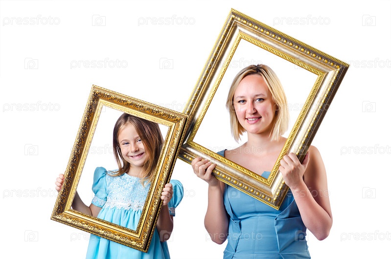 Счастливые мать и дочь на белом фоне